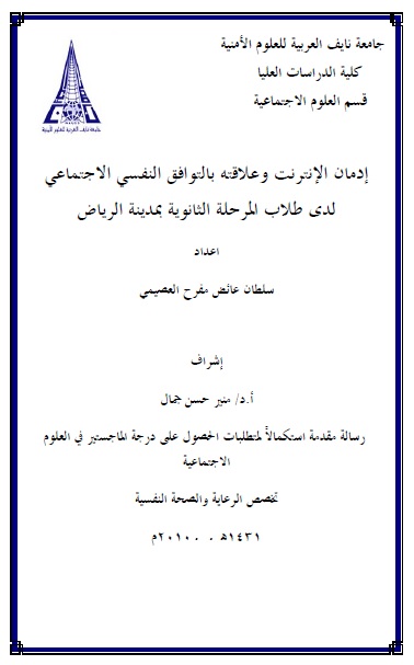 إدمان الإنترنت وعلاقته بالتوافق النفسي الاجتماعي لدى طلاب المرحلة الثانوية بمدينة الرياض... رسالة مقدمة من الطالب (سلطان عائض مفرح العصيمي) لنيل درجة الماجستير في تخصص الرعاية والصحة النفسية، تحت اشراف الأستاذ الدكتور منير حسن جمال.
